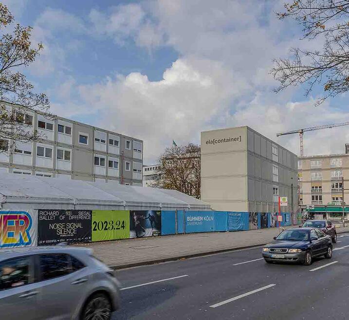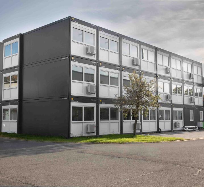 Czterokondygnacyjny zespół kontenerów budowlanych w centrum Kolonii